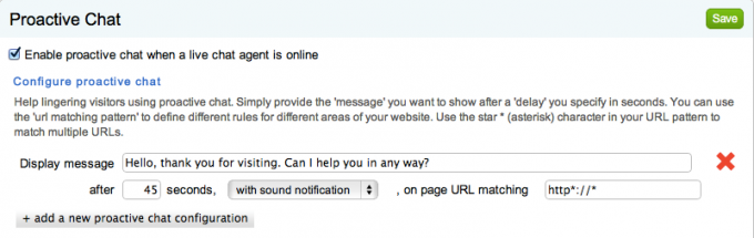 In the Shortcuts tab you can configure canned messages, so you don’t have to type the same message over and over again. You can also use this to configure shortcuts for our co-browsing feature using the goto command (e.g.: Shorten the ‘goto http://domain.com/products’ command to ‘g2p’) you can find more about setting these shortcuts here.